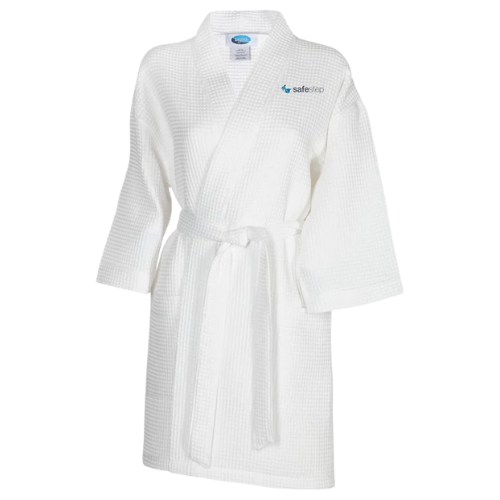 Pick up this classic Safe Step robe that is perfect for everyday! This flattering thigh-length, waffle-weave kimono robe is great for that spa-day feel after using your walk-in tub or shower. It features 3/4 length sleeves, two patch pockets, double belt loops and a self-belt. Made of 60% cotton/40% polyester woven, waffle-weave fabric, this luxuriously soft product measures 36" in length. One size fits most.